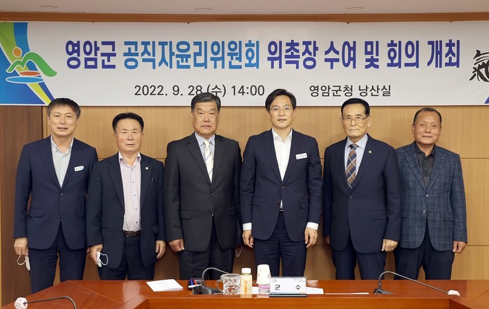 | ▲ 우승희 영암군수(오른 쪽부터 3번)가 지난 28일 군청 낭산실에서 2022년 제2회 영암군 공직자윤리위원회(이하 위원회) 위원 위촉장을 수여한 후 기념촬영을 하고 있다. / 영암군 제공 |