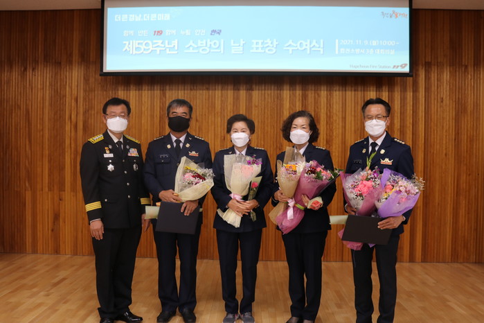 합천소방서(서장 김진옥)는 9일 제59주년 소방의 날을 맞아 소방행정 발전에 기여한 소방공무원, 의용소방대원 및 민간 유공자 등 41명에 대해 행정안전부장관, 소방청장, 도지사, 소방서장 표창장 등을 수여했다.