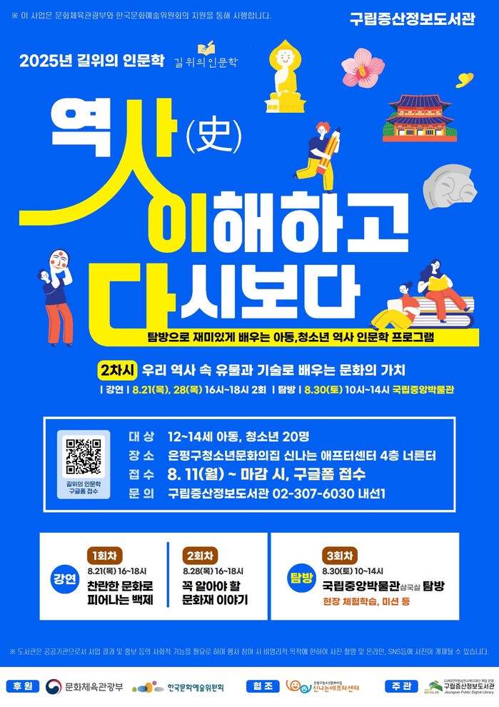 이번 프로그램은 문화체육관광부와 한국도서관협회가 주최하는 ‘길 위의 인문학’ 사업의 일환이다. ‘우리 역사 속 유물과 기술로 배우는 문화의 가치’를 주제로 8월 21일과 28일에는 은평구청소년문화의집 신나는애프터센터에서 강연 프로그램을 실시하고, 8월 30일에는 국립중앙박물관 현장 탐방이 진행된다.