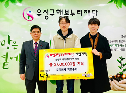 위 금액은 학교종이의 청년 개발자들이 전달하였으며 기부금은 유성구 행복누리재단 ‘새싹기금’에 적립되어 자립준비 청년의 요청에 따라 현금 또는 물품으로 전달될 예정이다.