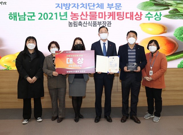 | ▲ 명현관 해남군수(우측부터 3)가 농림축산식품부가 주관한 2021년 지방차치단체 부문 농산물마케팅 대상에 선정돼 농림축산식품부 장관상을 수상하고 관계 공직자들과 기념촬영을 하고 있다. / 사진=해남군 제공 |