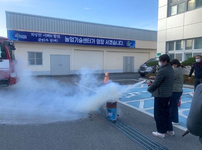 이번 훈련은 합천소방서와 연계하여 청내 직원으로 구성된 자위소방대가 각자 임무에 따라 화재 현장 대피 및 화재 진압과 응급 환자 이송을 하며, 실제 청사 내에 발생할 수 있는 화재 상황을 가정한 모의 훈련이었다.