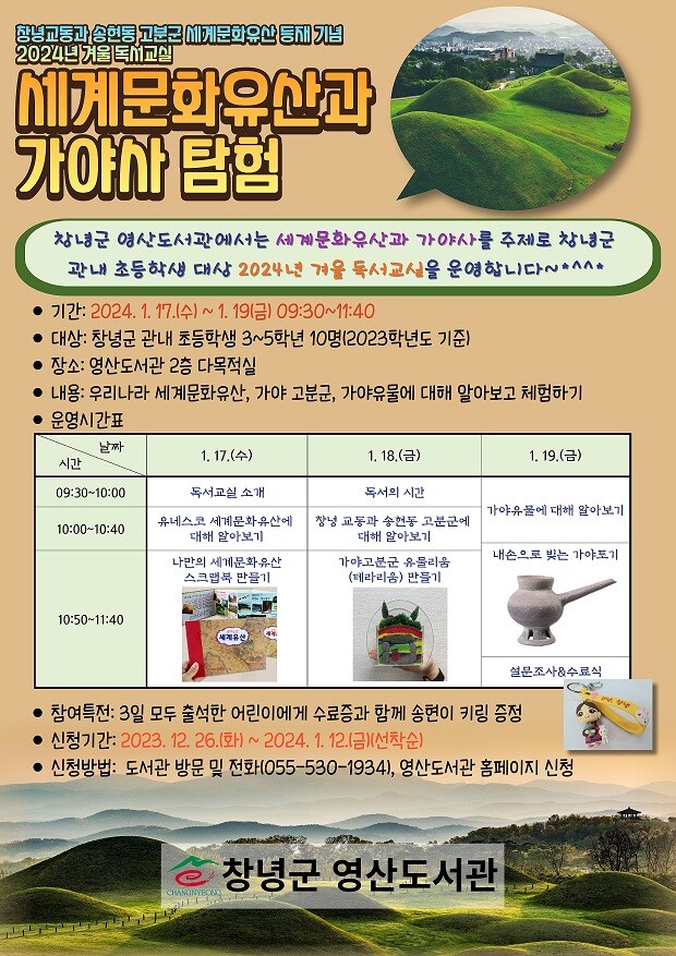 이번 겨울 독서교실은 2023년 창녕 교동과 송현동 고분군이 유네스코 세계문화유산에 등재된 것을 기념해 세계문화유산과 가야 고분군, 가야사 유물에 대해 알아보고 체험하는 시간으로 운영할 계획이다.