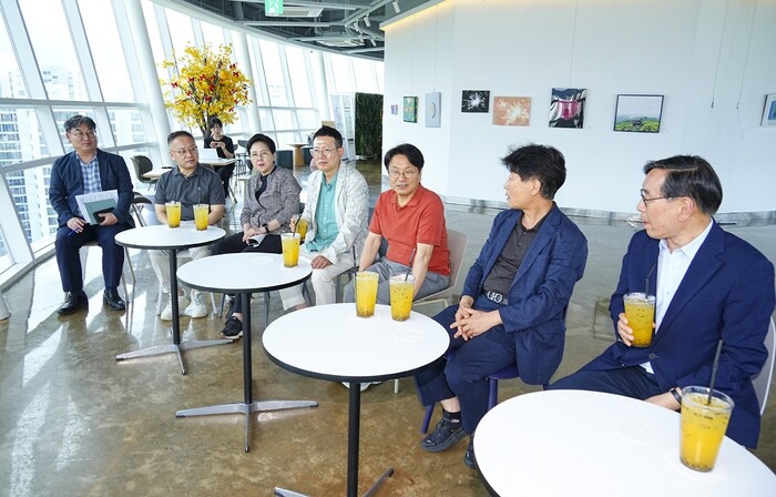 | ▲ 강기정 광주광역시장(사진 가운데)이 지난 10일 오후 남구 양림동에서 열린 제39회 정책소풍에 참석해 양림권역 근대역사문화 거점벨트 사업 관련, 사직공원전망타워에서 간담회를 하고 있다./광주광역시 제공 |