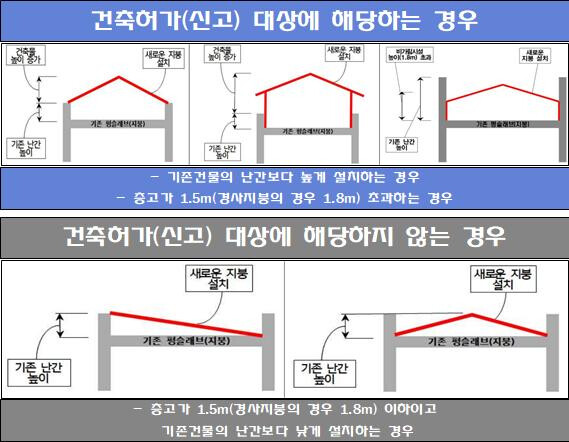 옥상 비가림시설이 기존 옥상 난간보다 높거나, 옥상 바닥으로부터 1.5미터(경사 지붕은 1.8미터)를 초과할 경우 이는 증축에 해당되어 반드시 합천군청 도시개발허가과 건축허가팀에 신고 또는 허가를 받아야 한다. 만약 이를 무시할 경우, 위반 건축물로 지정되어 자진 철거 및 원상 복구가 요구되고, 매년 이행강제금이 부과되며, 건축물대장에도 ‘위반건축물’로 표기되어 각종 인허가 및 등록 행위 시 제한 등의 불이익을 받게 된다.
