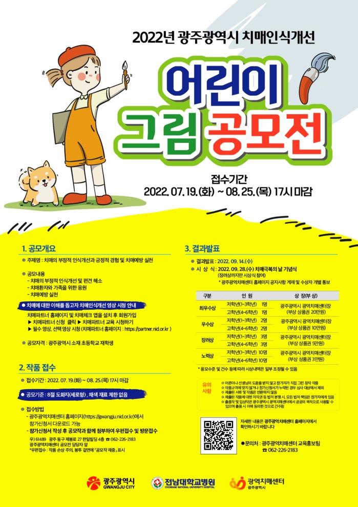 공모작품 제출은 우편 및 방문을 통해 하면 되며, 자세한 내용은 광주광역시 광역치매센터 교육홍보팀으로 문의하거나 홈페이지에서 확인할 수 있다.