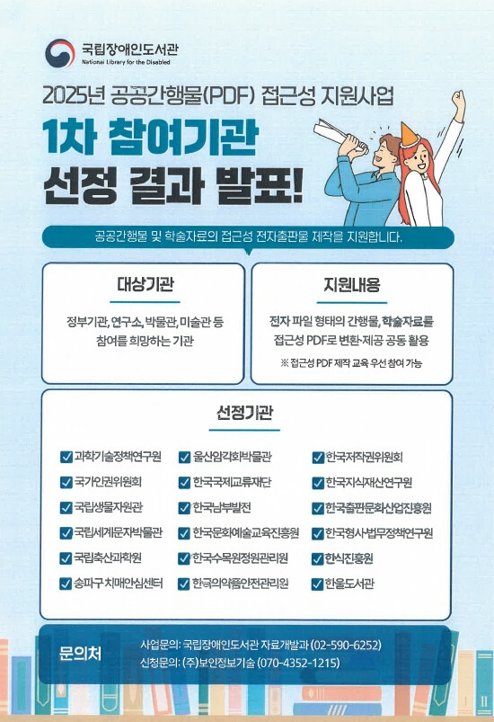 ‘2025년 공공간행물(PDF) 접근성 지원사업’은 시각장애인, 고령자, 학습장애인 등 정보 접근에 어려움을 겪는 약자를 위해 공공기관이 제작한 간행물을 장애인 접근형 전자출판물(PDF/UA)로 변환·보급하는 사업이다.