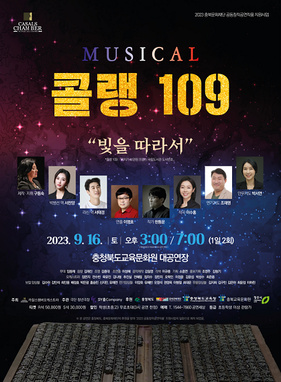 [청주=최성일 기자] 충청북도교육청 직속기관 교육문화원(원장 지선호)이 대공연장에서 16일(토), 도내 초.중.고등학교 학생 및 학부모를 대상으로 뮤지컬 「콜랭109」공연을 실시한다.