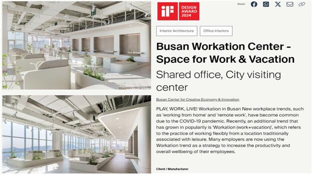 어워드를 주관하는 'iF 인터내셔널 포럼 디자인'은 “부산 워케이션 센터는 탁 트인 바다 전망과 효율적인 실내 업무공간 배치로 일의 효율성 향상은 물론 사용자들의 재충전이 가능한 공간으로 구성돼있다”라고 평가했다.
