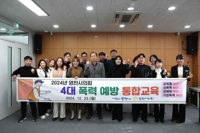 [영천=박병상 기자] 영천시의회(의장 김선태)는 지난 23일 의회사무국 전 직원을 대상으로 ‘성희롱.성폭력.성매매.가정폭력 등 4대 폭력 통합예방’ 교육을 실시했다.