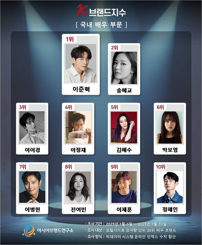 이번 K-브랜드지수 국내 배우 부문은 포털사이트 검색량 상위 30위 배우 브랜드 대상으로, 2025년 1월 1일부터 1월 31일까지의 온라인 빅데이터 6529만 5897건을 분석해 산출했다.