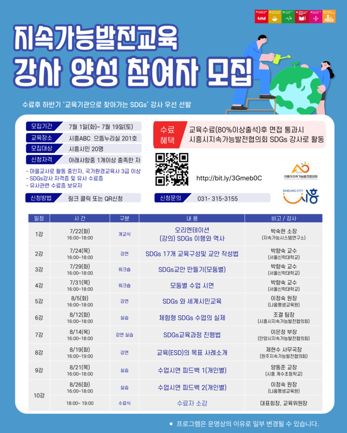 모집 인원은 총 20명이며, 시흥시민 중 마을교사 활동 경력자, 환경교육사 자격증 소지자, SDGs 강의 유경험자 등이 신청 가능하다. 참가접수는 온라인 QR코드 또는 접수링크를 통해 하면 된다.