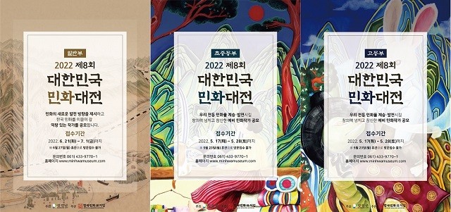 공모 접수는 학생부는 오는 5월 17일(화)부터 28일(토)까지, 일반부는 6월 21일(화)부터 7월 1일(금)까지이다. 참가신청은 한국민화뮤지엄 홈페이지 공모전 접수 메뉴를 이용해 온라인 접수 후 작품을 발송하면 된다.