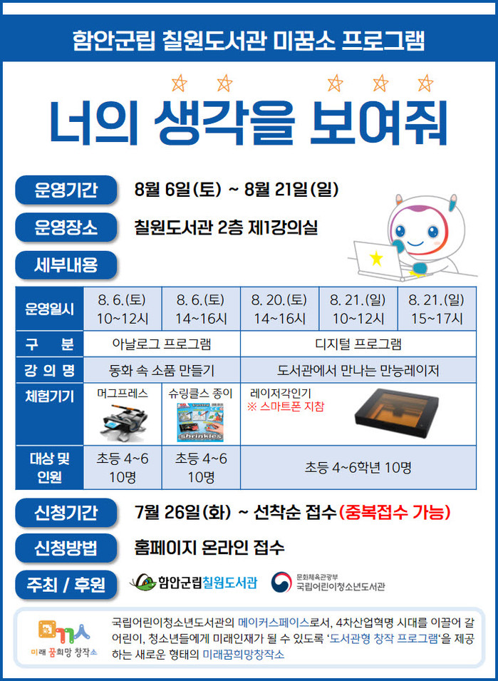 한편, 미꿈소(미래‧꿈‧희망창작소) 네이밍 브랜드 화 사업은 국립어린이청소년도서관이 4차 산업혁명 시대를 이끌어 갈 어린이에게 ‘도서관 형 창작 프로 그램’ 을 제공하기 위해 진행하는 공모 사업으로, 올해 선정된 전국 17개관 중 함안 군립 칠원 도서관이 선정돼 관내 어린이에게 색다른 경험의 기회를 제공할 수 있게 됐다.
