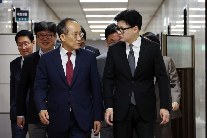 이날 추 원내대표는 전날 친한계 의원들이 의원들 단톡방에서 특별감찰관 임명 절차 추진에 대한 입장 설명을 요구하는 등 불만을 제기한 데 대해 “국감을 다 마치고 의원님들 의견을 듣는 의원총회를 개최하도록 하겠다”고 밝혔다.