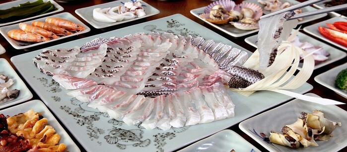 | ▲ 강진마량 횟집 거리 해산물 한상 차림 / 강진군 제공 |