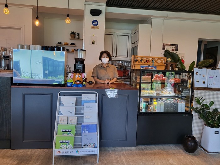 | ▲ 사람들이 많이 찾는 다중이용시설인 군서면 소재 카페에 비치된 영암군 홍보물 게시대 / 영암군 제공 |