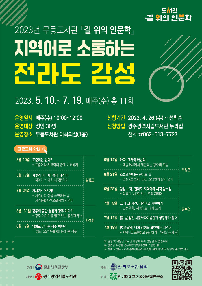 ‘지역어로 소통하는 전라도 감성’을 주제로 열리는 인문학 프로그램은 5월 10일부터 7월 19일까지 매주 수요일 총 11회에 걸쳐 진행된다.