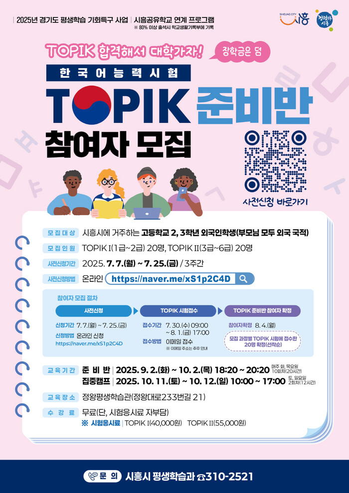 이번 과정은 부모 모두 외국 국적인 고등학생을 대상으로 하며, TOPIKⅠ(1~2급) 및 TOPIK II(3~6급) 2개 반에 각 20명씩 총 40명을 선발해 맞춤형 교육을 진행한다. 수강을 희망하는 학생은 7월 7일부터 7월 25일까지 온라인 링크 또는 포스터 내 정보무늬(큐알코드)를 통해 온라인 사전 신청 후, 7월 30일부터 8월 1일까지 진행하는 한국어능력시험(TOPIK)에 접수를 완료해야 한다. 이후 선착순 40명을 최종 선정할 계획이다.