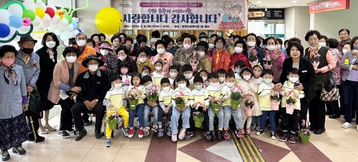 이날 행사에서는 치매안심센터 직원들을 비롯한 합천어린이집(원장 오경희) 원아 26명이 치매안심센터 행사 부스에서 미리 준비한 선물을 드리고, 카네이션을 어르신들 가슴에 달아드리면서 감사의 마음을 전했다.