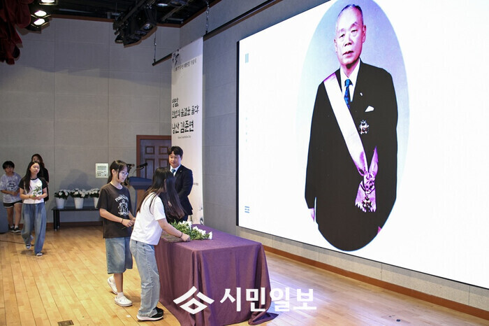 기념식에서 인공지능(AI) 기술의 도움으로 낭산 선생이 모교 후배들에게 웃으며 인사를 건네고 응원의 메시지를 보냈다.