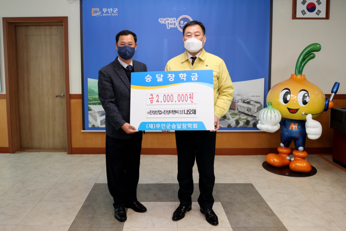 | ▲ ㈜진성산업·㈜진성이앤씨 나오재 총괄대표, 승달장학금 200만원 기탁.(출처=무안군청) |