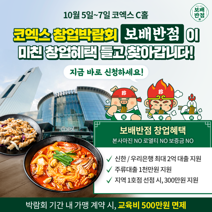 보배반점은 이번 박람회에서 예비 가맹점주를 대상으로 창업 트렌드와 예산 규모에 맞는 창업 설계는 물론 보배반점이 가진 강점과 체계적인 시스템에 대해 맞춤형 상담을 할 예정이며, 특히 이번 박람회 기간에 보배반점 부스를 방문하는 예비창업자들을 위해 특별한 혜택을 제공할 예정이다.