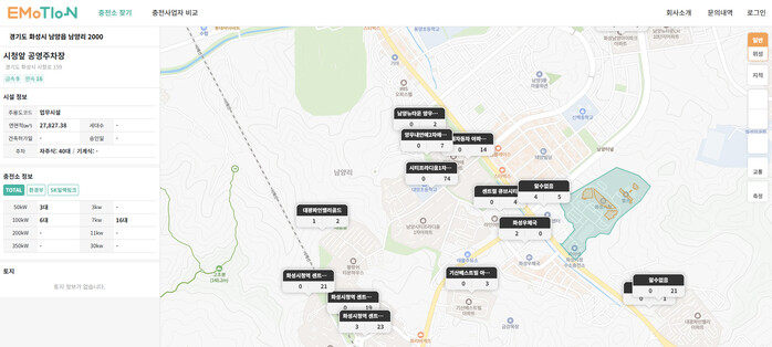 시스템은 포털 사이트에 ‘이모션플레이스’를 검색한 후 접속할 수 있으며, 사이트에서는 시설유형, 충전 속도, 충전기 타입, 충전 사업자 등 유형별 전기차 충전시설을 확인할 수 있다.