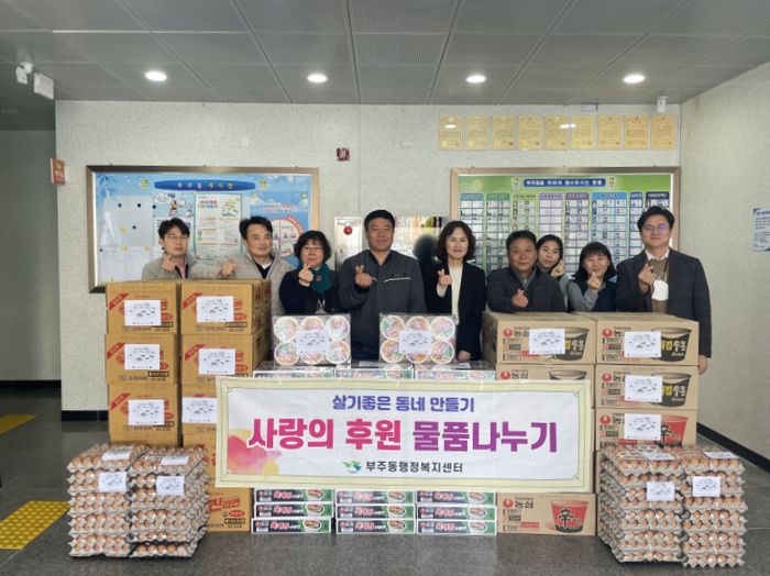 부주동에서는 부주동 방위협의회(컵라면 20박스), 부주동 지역사회보장협의체(계란 35판), 중앙교회(라면 30박스), 롯데슈퍼 목포옥암점(빼빼로 6박스), 익명의 독지가(컵라면 50박스)가 설명절을 맞아 소중한 물품을 기탁했다.