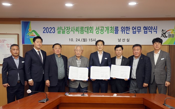 영암군은 대한씨름협회와 지난 24일 군청 낭산실에서 2023년‘위더스제약 2023년 설날장사씨름대회’개최에 대한 업무 협약식을 가졌다.