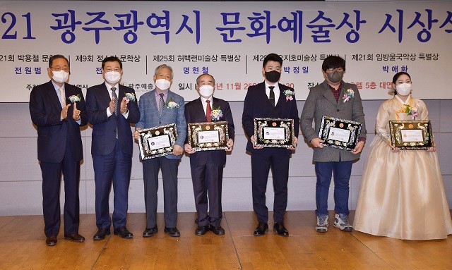 [광주=정찬남 기자] 광주광역시는 25일 라마다호텔에서 ‘2021년 문화예술상 시상식’을 열고 문학, 미술 등 4개 부문에 선정된 5명에게 상패를 수여했다.