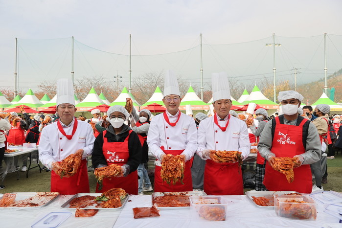 | ▲ 명현관 해남군수(가운데)가 세계인과 함께하는 515포기 김치를 담궈 선보이고 있다.(사진제공=해남군) |