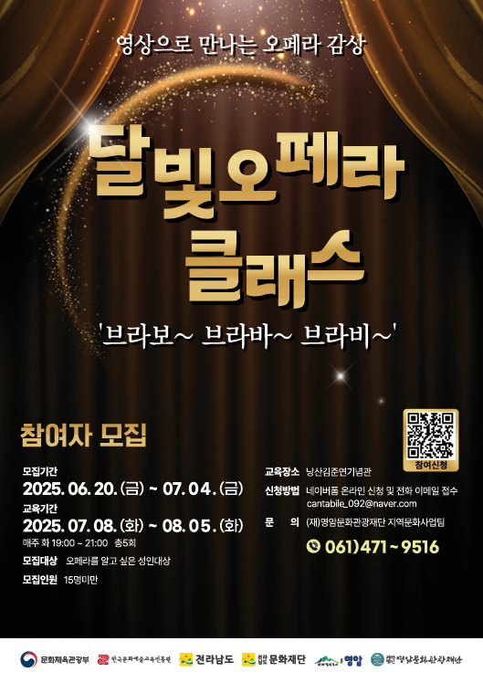오페라를 사랑하는 이들은 누구나 영암문화관광재단 및 영암군 누리집에 안내된 네이버 신청폼, 전화, 이메일을 통해 7월 4일까지 신청할 수 있다.