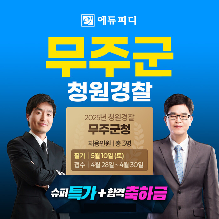 이에 에듀피디는 2025년 무주군 청원경찰 필기시험 대비 전 과목 ‘이론+문제풀이+기출해설’ 구성의 ‘합격 패키지’ 강좌를 ▲30일 ▲60일 ▲90일 ▲180일 수강 과정으로 오픈하고 ‘슈퍼특가’ 할인 혜택과 함께 합격시 최대 20만 원의 ‘합격 축하금’을 지급하는 ‘슈퍼특가+합격축하금’ 프로모션을 진행한다고 설명했다.