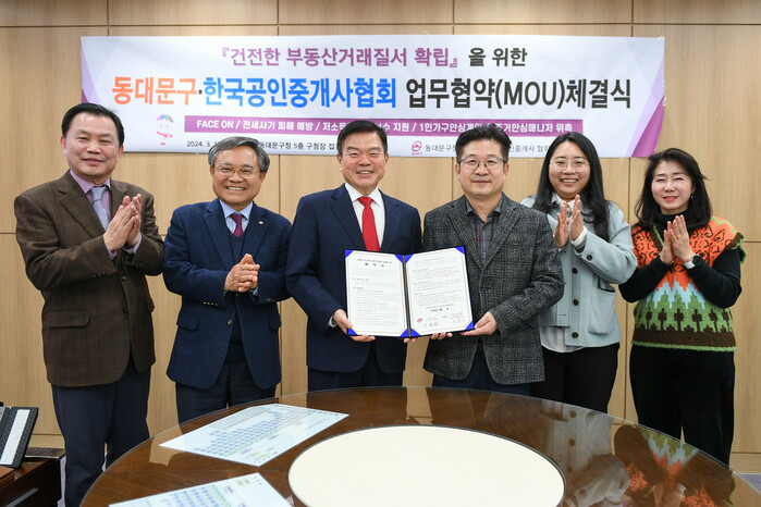 [시민일보 = 이대우 기자] 서울 동대문구(구청장 이필형)는 최근 한국공인중개사협회 동대문구지회와의 업무협약(MOU)을 통해 건전한 부동산거래질서의 확립과 동대문구 부동산중개업 발전을 위한 상호 협력을 강화했다.