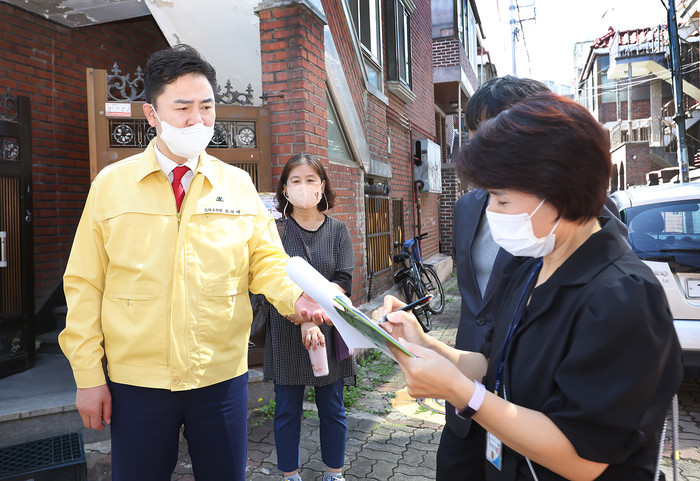 | ▲ 동주민센터 직원과 함께 신고된 위기가구에 방문해 현장 실태조사를 실시하고 있는 오언석 도봉구청장. |