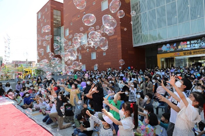 | ▲ 지난 2022년 5월5일 어린이날 비누방울 날리기 퍼포먼스에 환호하고 있는 어린이들 / 광주광역시 제공 |
