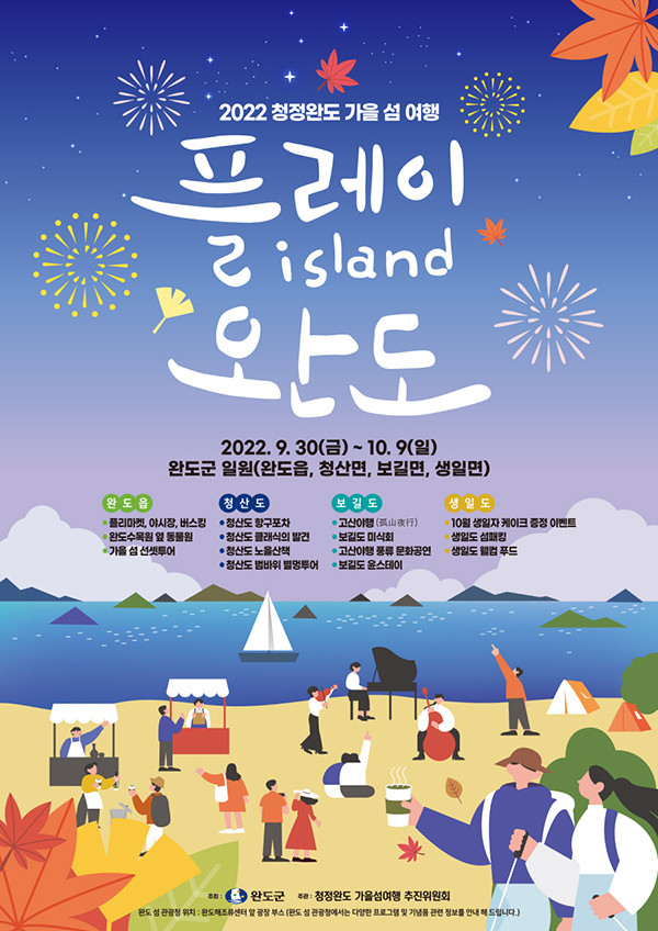 이번 행사는 완도읍, 청산도, 보길도, 생일도를 중심으로 운영되며, 청정완도 가을섬의 아름다운 자연경관과 더불어 섬의 매력을 직접 경험하고 즐길 수 있는 다양한 프로그램을 준비했다.