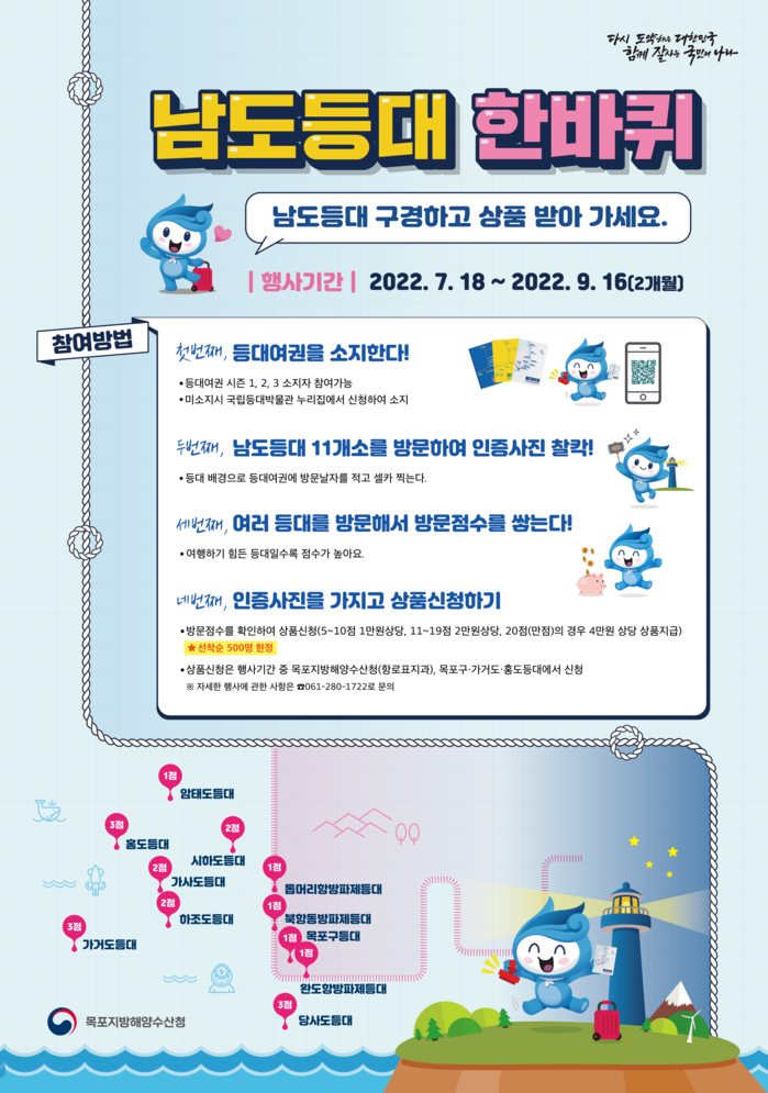 코로나19 사회적 거리두기가 완화되고 여름 휴가철을 맞아 바다나 섬을 찾는 여행객이 증가할 것으로 예상됨에 따라 목포해수청에서는 역사・문화적으로 가치가 높은 등대를 여행하고 상품도 받을 수 있는 행사를 준비했다.