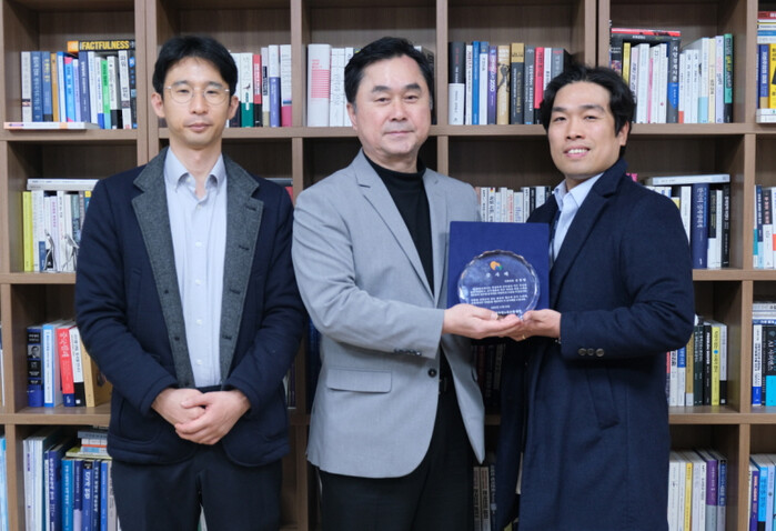| 복지부 노조 정승문 위원장(오른쪽)이 김종민 국회의원(가운데)에게 감사패를 전달하고 있다. (사진=보건복지부 공무원노동조합) |