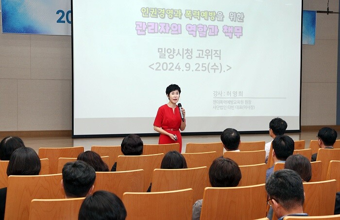 이날 허영희 한국양성평등교육원 강사는‘인권 경영과 폭력 예방을 위한 관리자의 역할과 책무’라는 주제로 △폭력의 유형별 사례와 시사점 △갑질과 스토킹 사례 △폭력 예방을 위한 행동 지침 △폭력 발생 후 관리자의 역할과 책무 △좋은 관리자의 모습 등을 강연했다.