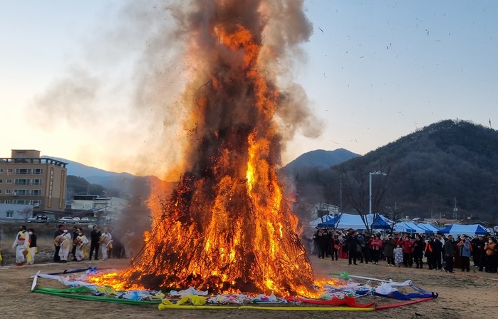 면민의 안녕과 풍년을 기원하는 풍년기원제 이어 가족의 건강과 행복을 기원하며 달집이 점화돼 정월대보름 분위기는 최고조에 달했다. 야로 주민들은 활활 타오르는 달집을 보며 액운을 쫓고, 올 한해 좋은 일만 가득하길 기원했다.