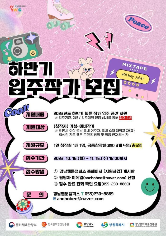 신청기간은 지난 16일부터 오는 11월15일까지이며, ‘경남웹툰캠퍼스’ 홈페이지를 통해 공고 게시물을 참고, 신청하면 된다.