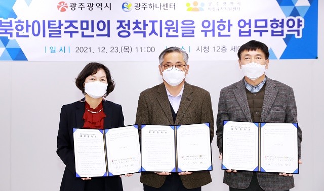 [광주=정찬남 기자] 광주광역시는 23일 시청 세미나실에서 광주하나센터, 광주광역시비정규직지원센터와 업무협약을 체결하고 북한이탈주민의 지역사회 안정적 정착을 위해 협력 관계를 강화키로 했다.