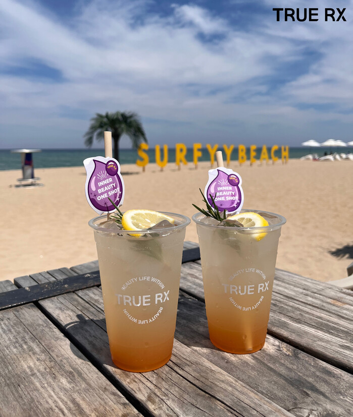 우선 양양 서피비치 선셋바 내에는 트루알엑스의 리치 글루타치온 포텐원샷과 리치콜라겐4X를 섞어 만든 레몬 뷰티에이드를 포함해 트루알엑스 전용 컵과 토퍼로 서피비치와 잘 어울리는 스페셜한 음료를 제공한다. 인증샷용 레터링 거울과 선셋바 내 네온조명 등도 설치했다.