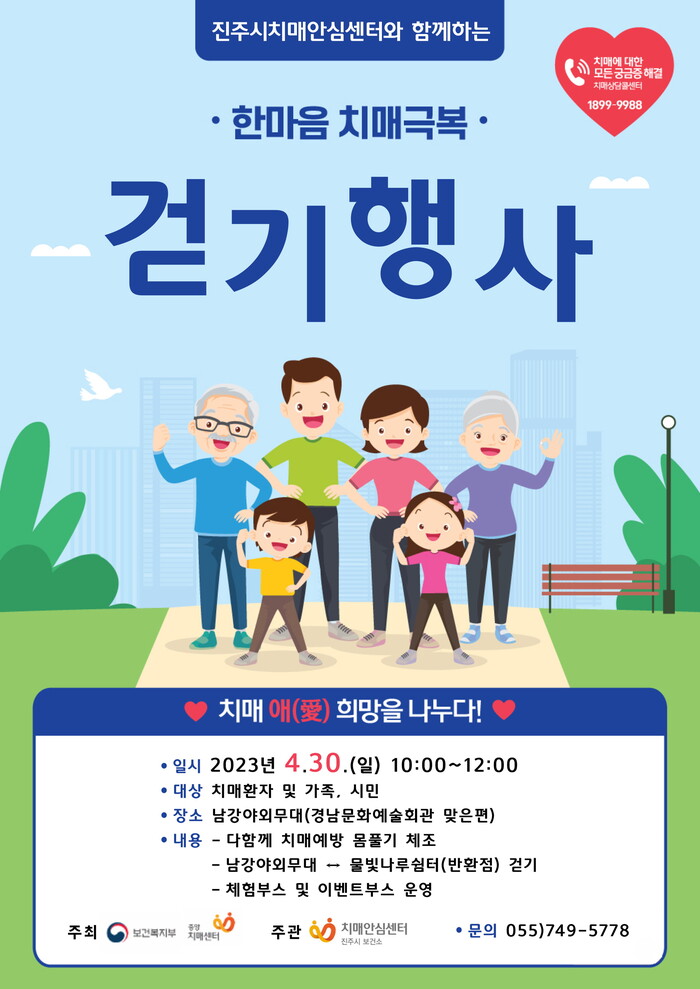 참가 신청은 당일 현장에서 무료로 접수 가능하며, 걷기 완료자 500명에게는 소정의 기념품을 제공한다. 기타 자세한 사항은 진주시 치매안심센터로 문의하면 된다.