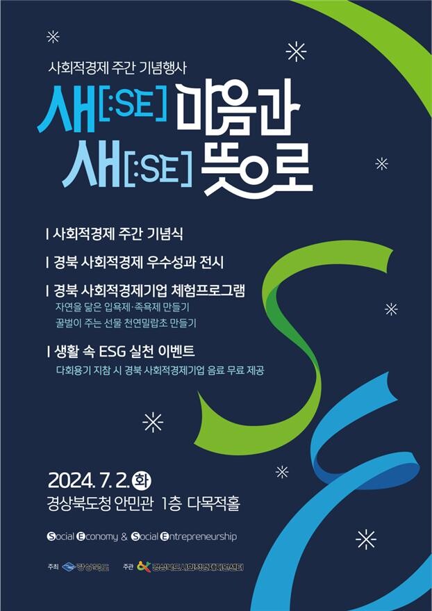 [안동=박병상 기자] 경상북도는 2일 도청 안민관 다목적홀에서 ‘새(:SE)마음과 새(:SE)뜻으로’라는 주제로 사회적경제 주간 기념행사를 개최한다.