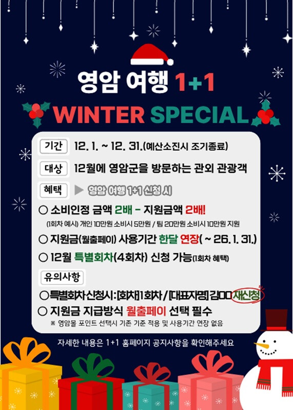 우승희 영암군수는 “눈 내린 월출산국립공원과 영산강, 구림마을 한옥 등 겨울 풍경이 아름다운 영암에서 가족·연인·친구와 함께 따뜻한 여행을 즐기고, 영암여행 1+1의 혜택도 두배로 누려보길 바란다”고 말했다.