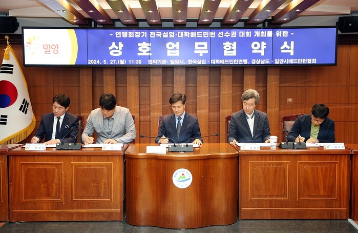 안병구 밀양시장, 권성덕 한국실업배드민턴연맹 부회장, 이덕준 한국대학배드민턴연맹 전무이사, 이창우 경상남도배드민턴협회 부회장, 정상우 밀양시배드민턴협회 회장 등 관계자 14명이 참석한 이날 협약식에서 2025년부터 2027년까지 3년간 밀양에서 연맹회장기 전국실업‧대학배드민턴 선수권대회를 개최하기로 약속했다.