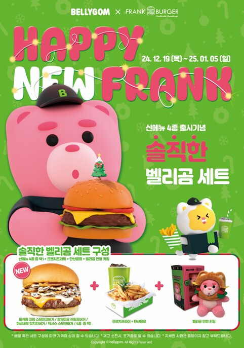 프랭크버거 관계자는 “벨리곰이 콜라보레이션 영상 촬영 중 사라질 정도로 신메뉴 4종의 풍미가 대단하다”며, “특히 벨리곰 인형 키링은 귀엽고 실용적이어서 연말 선물이나 크리스마스 오너먼트로 활용하기에도 제격이다. 고객들이 프랭크버거와 벨리곰의 협업을 통해 즐거운 추억을 만들길 바란다”고 전했다.